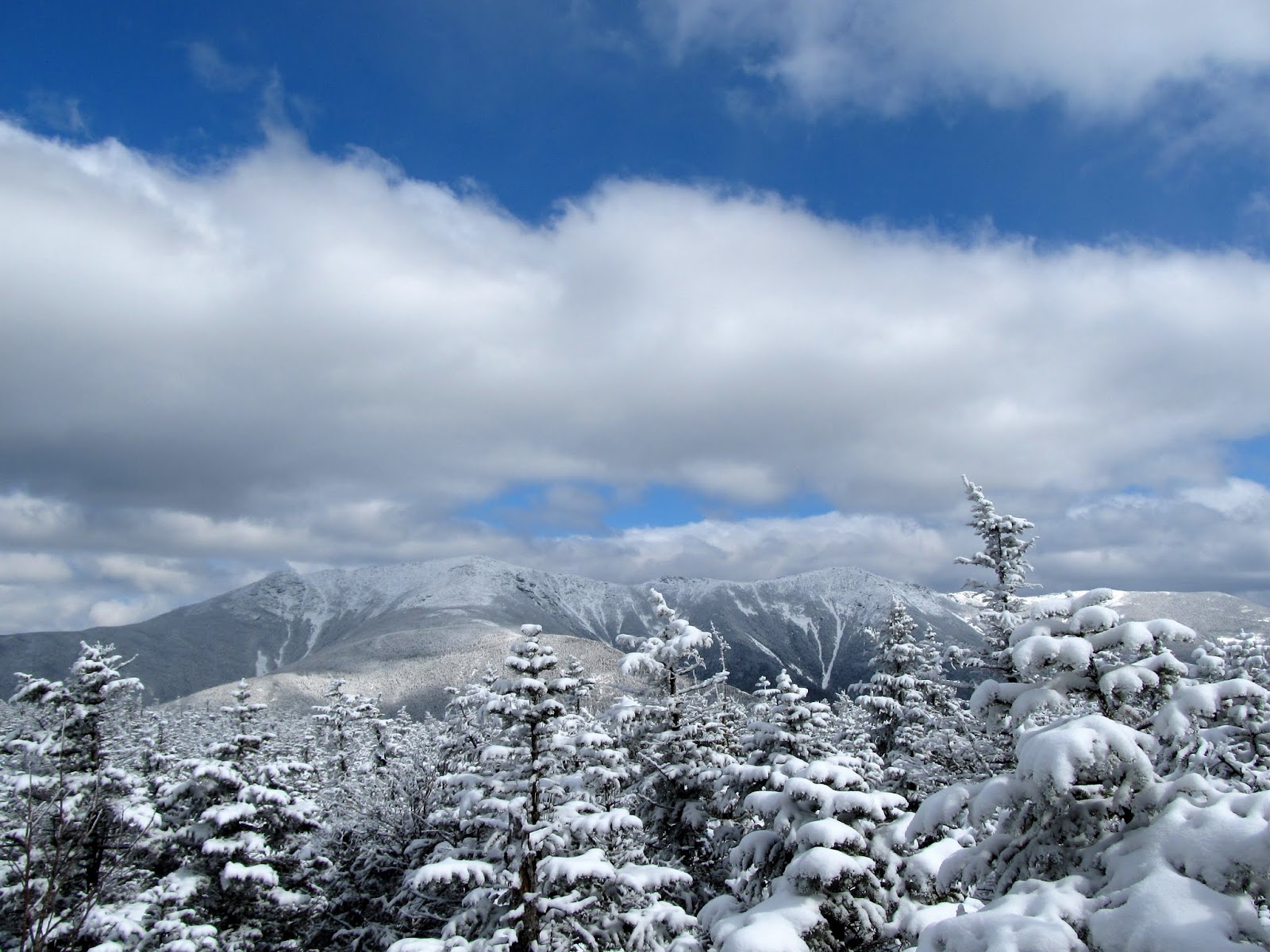 Watching the weather forecast for the weekend Saturday was looking iffy and Sunday much better. This was a case though where a bluebird day wasn't the most important criteria. I wondered how often Randy thought about the weather before his hikes. Blue skies vs. clouds weren't very important for him. A sobering thought. As we drove up Rt 93 on Saturday morning we went through several snow squalls that promised a new frosting on the mountain. The weather had called for this for most of the day along with mostly cloudy skies. Not a problem. By the time we pulled into the parking lot the skies had cleared and the brilliant blue was only punctuated by some drifting cotton candy clouds. It's not always bad when the weatherman is wrong.